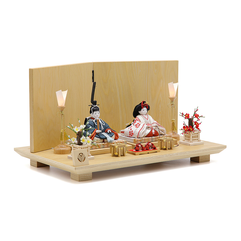 飾り台と屏風(二曲屏風)は、埼玉県内で製作した板目の木目が特徴的な栓の木で製作しています。木の断面のような自然の木目が美しい品です。上品で高級感溢れる親王様によく似合います。