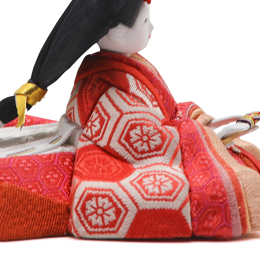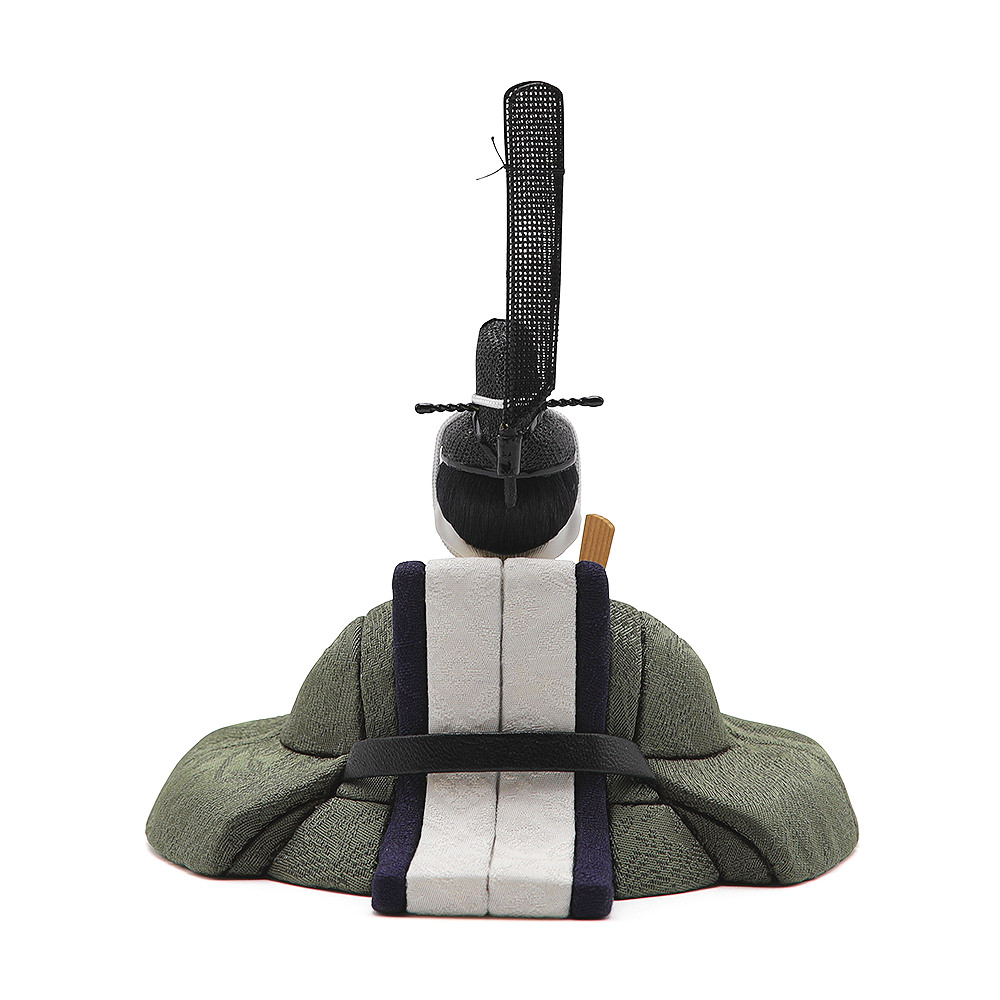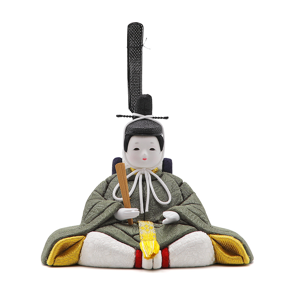麹塵色と鮮やかな赤色のお衣装の組み合わせが魅力的な親王様。伝統的な日本柄の落ち着いた雰囲気と格式高い印象が大変魅力的です。お衣装は工房こだわりの京都で製作した、格式高い正絹の織物を使用しています。