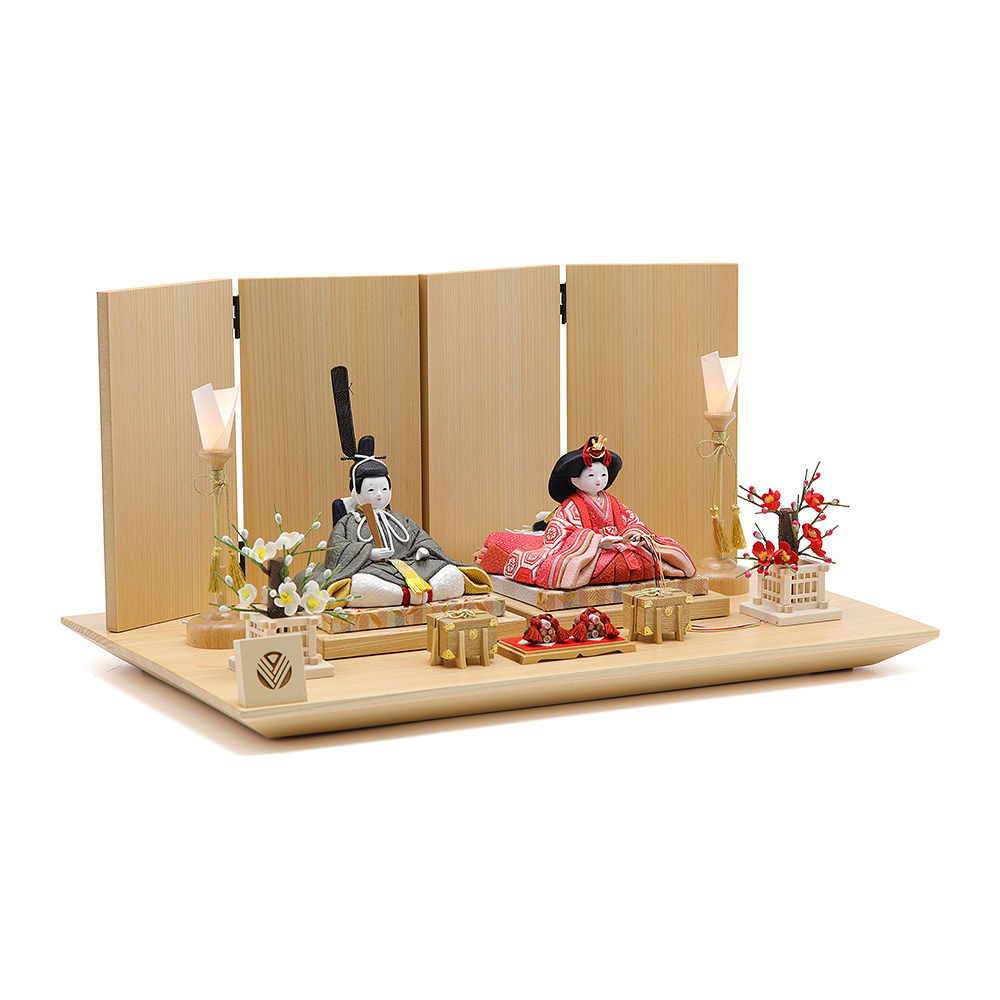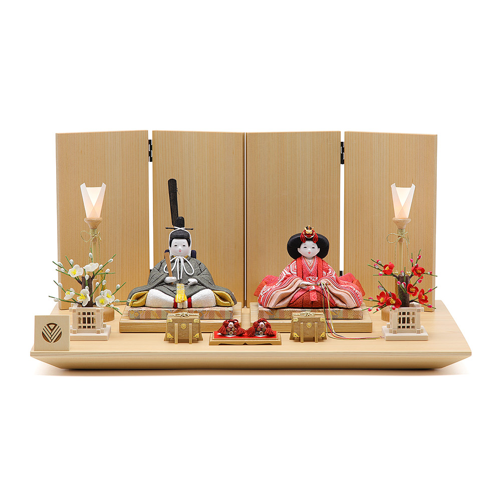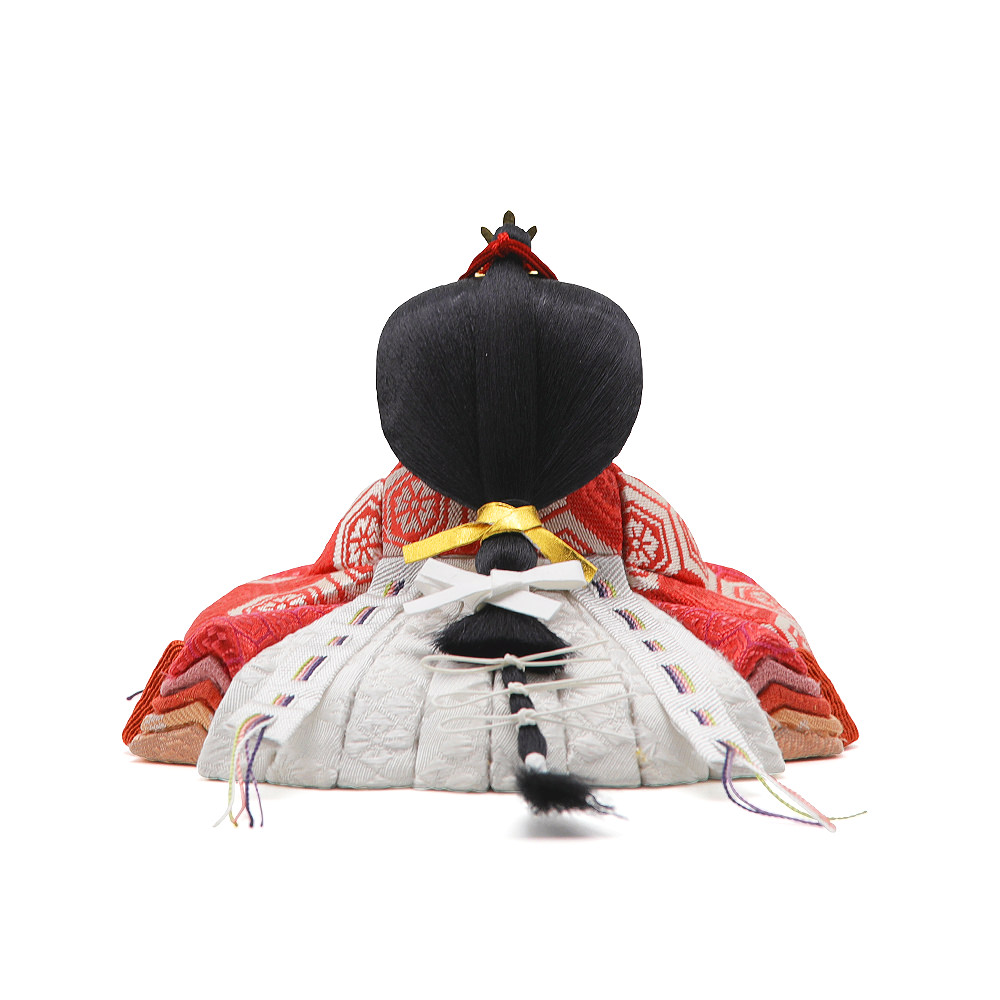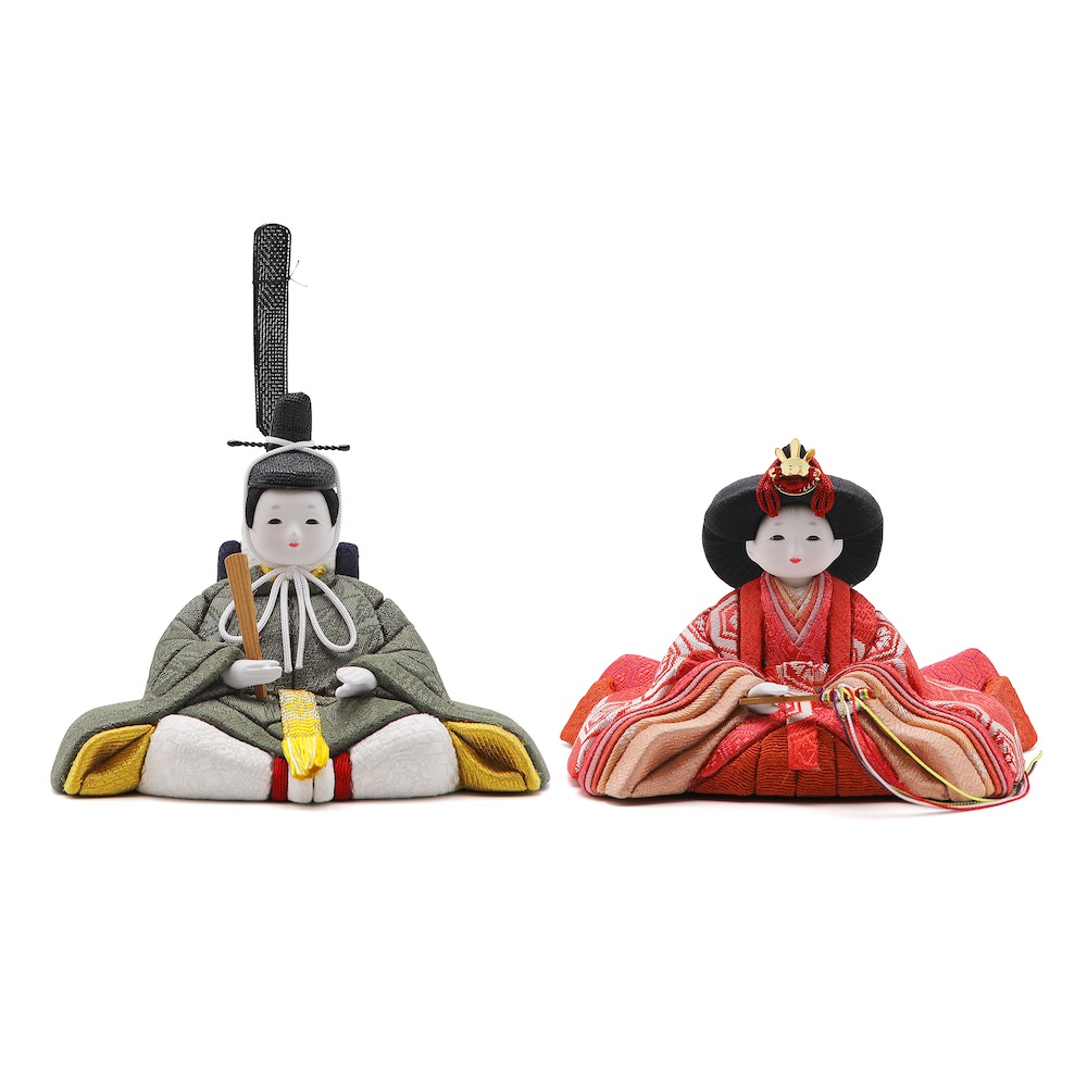 麹塵色と鮮やかな赤色のお衣装の組み合わせが魅力的な親王様。伝統的な日本柄の落ち着いた雰囲気と格式高い印象が大変魅力的です。お衣装は工房こだわりの京都で製作した、格式高い正絹の織物を使用しています。
