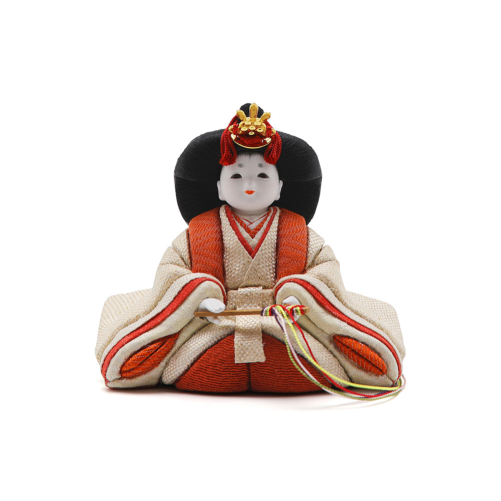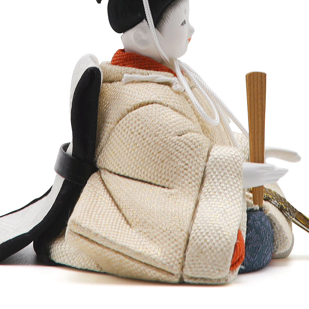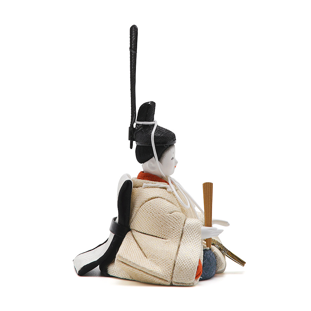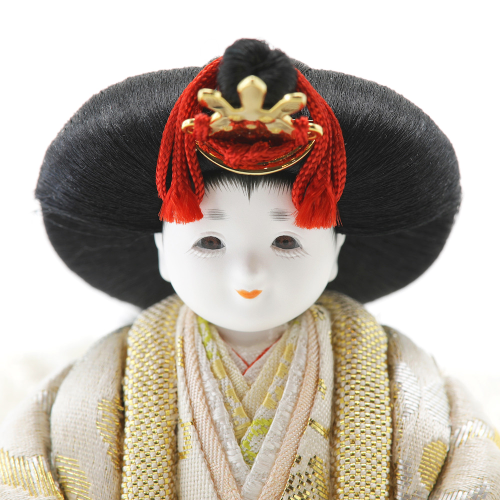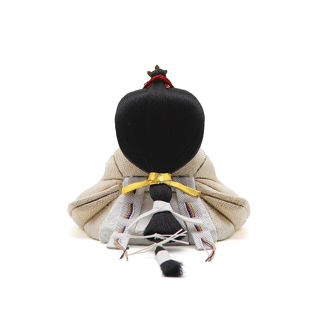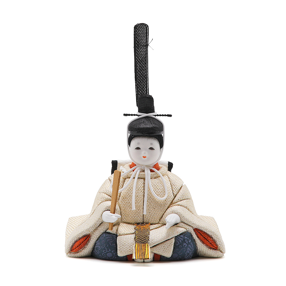柄のあまりないシンプルなお衣装に可愛らしさを感じさせる親王様。お衣装は工房こだわりの正絹の織物を使用しています。少々光沢のある生成色のお衣装はどこかモダンな新しさを感じる親王様です。