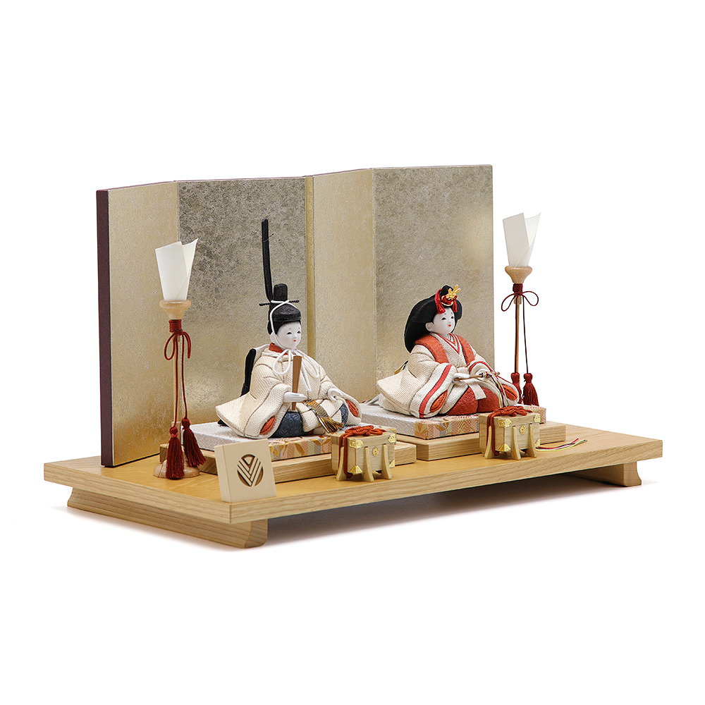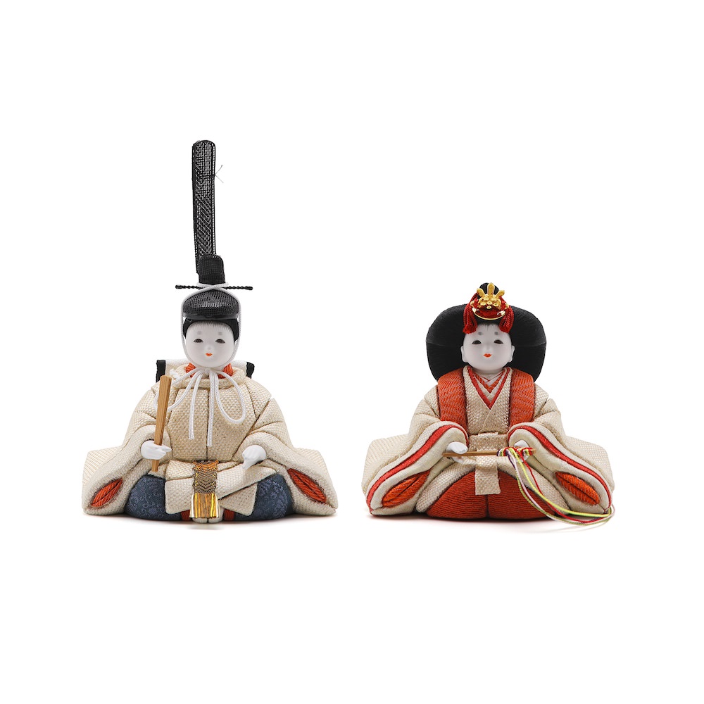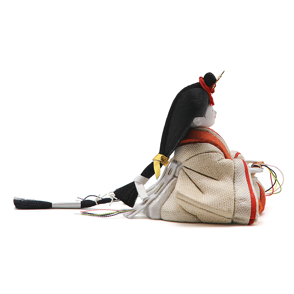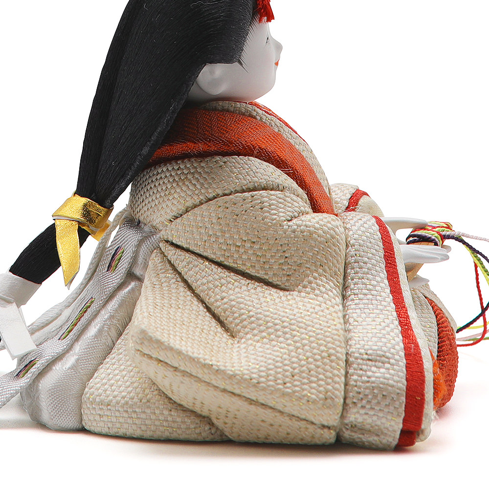 若干光沢と質感のある柄のないシンプルな生成色のお衣装を殿、姫お揃いに。殿は袴にくすんだ紺色、袖口に朱色。姫は差し色は朱色で統一しました。シンプルな美しさ、質感を重視してこだわり抜いて仕上げました。京都で製作した最高級の上質な正絹の織物のみを利用した大変上品なお衣装。工房ひな雛では原則正絹(シルク)をどのお人形においても使用しています。