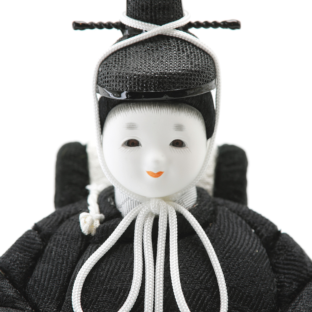 木目込人形では通常は「書き目」と言われる筆で目を書く技法が使われますが、工房ひな雛では小さいお顔にガラスの目を入れることでより可愛らしいお雛様に仕上がる 「入れ目」技法を採用しています。