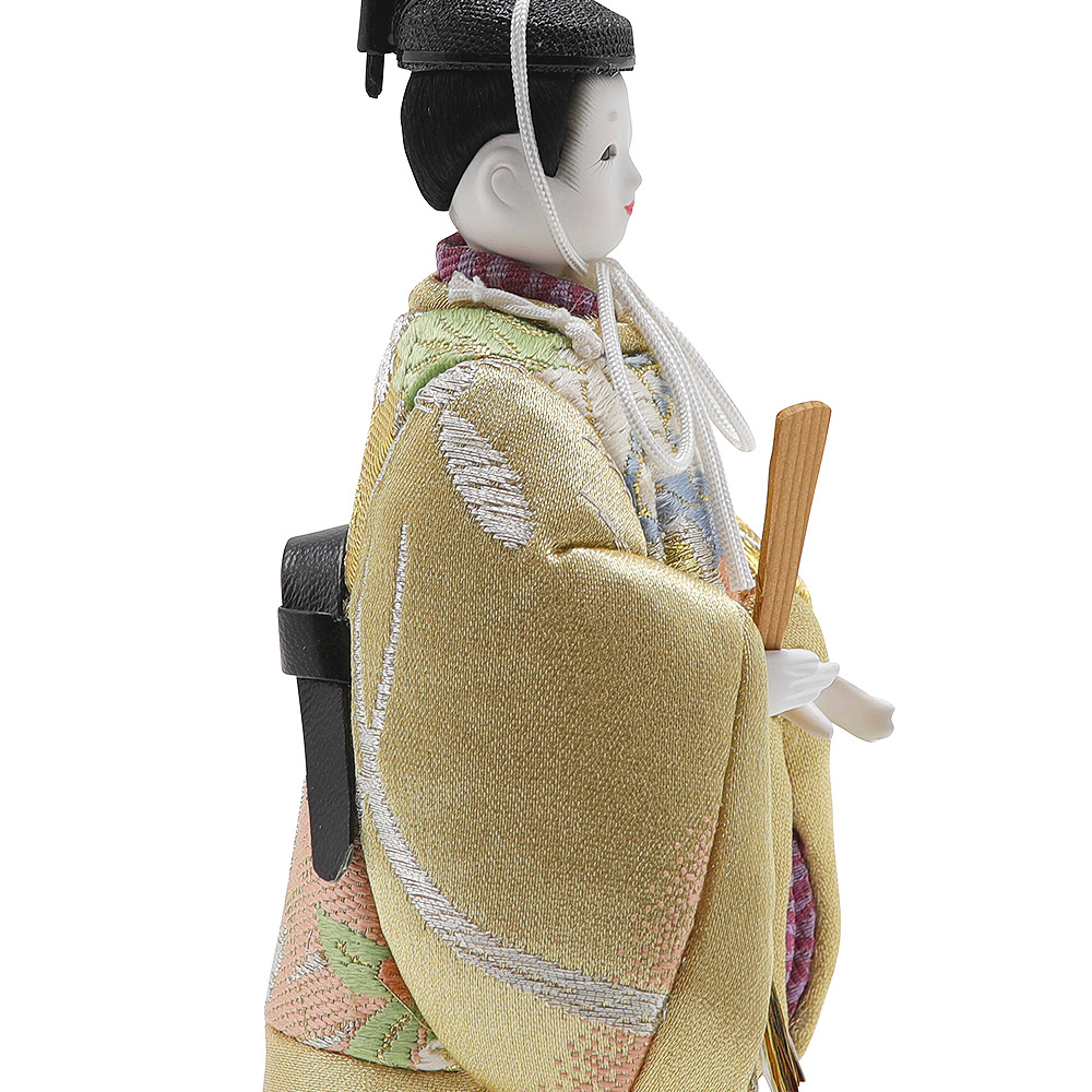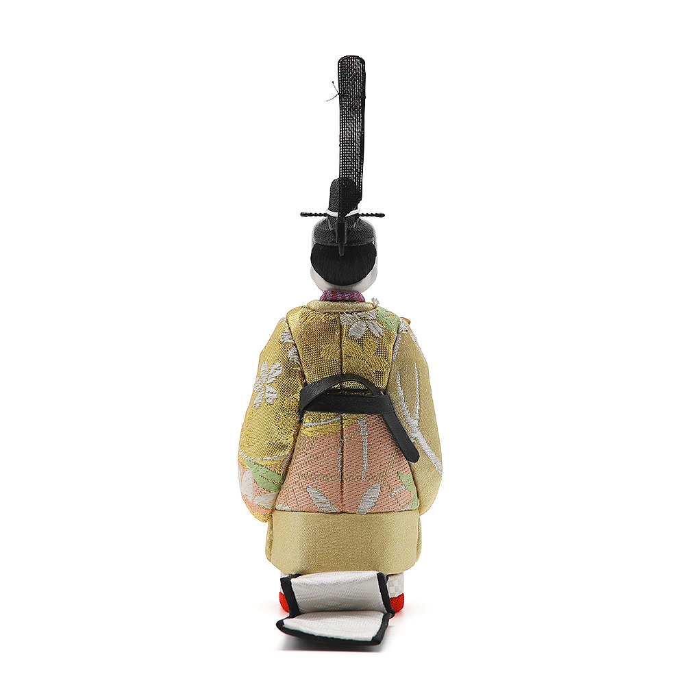 帯地のきらきらとした光沢のあるお衣装は大変高級感を感じる逸品です。金色とベージュの中間色のようなお色を使用して織られた大変格式高い織物です。薄い水色、淦色、緑色など様々な淡いお色で流水のような花柄を描いています。落ち着いた雰囲気がありつつも大変華やかで美しいです。工房ひな雛では原則正絹(シルク)をどのお人形においても使用しています。