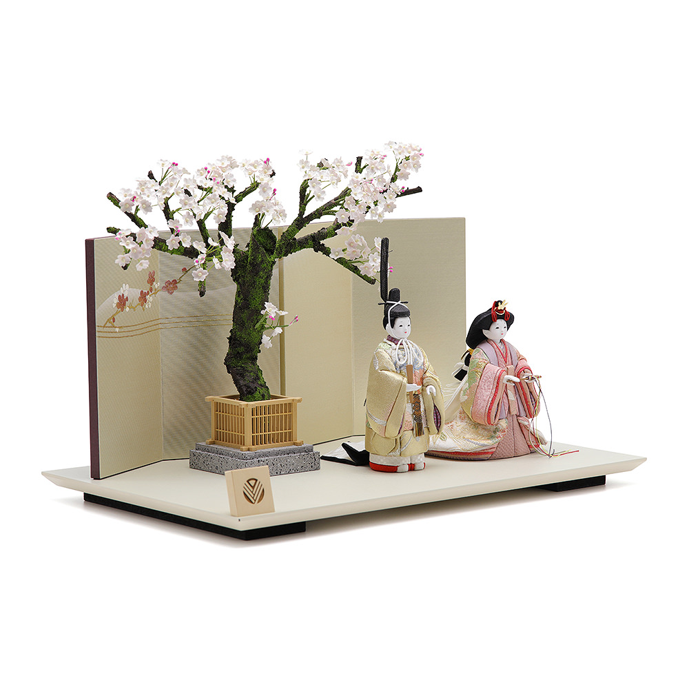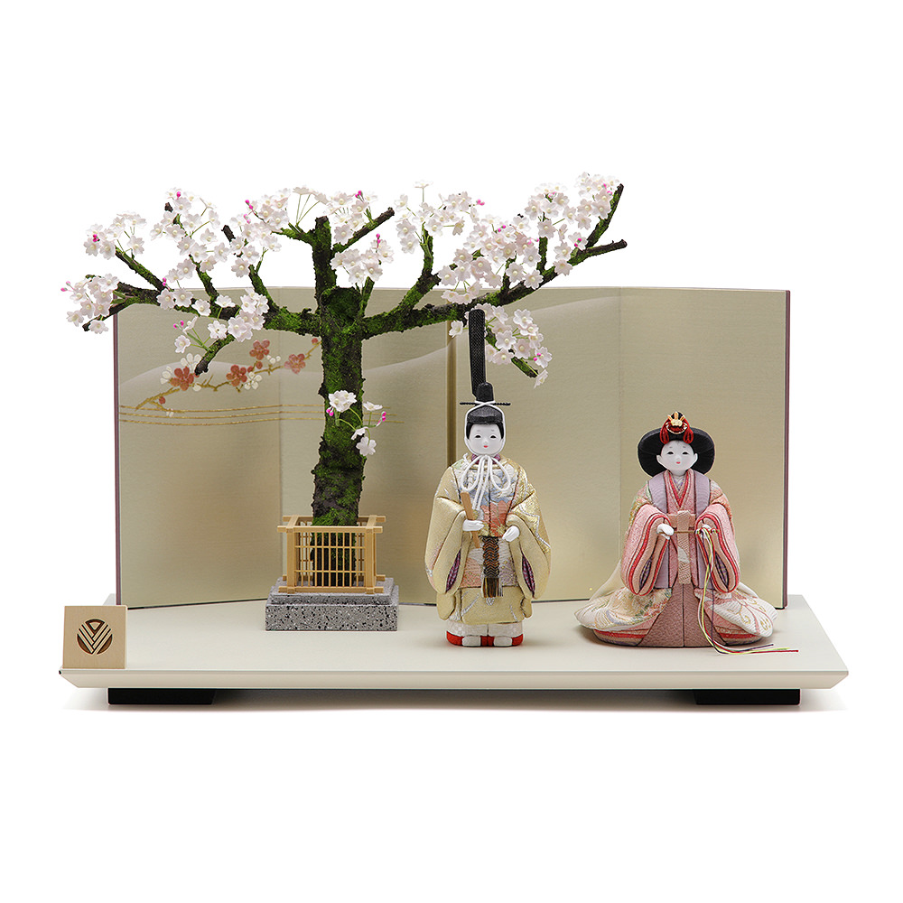 お花には、存在感の大きな桜の木を飾りました。淡いお色のお衣装の親王様によく似合う春の日を思わせるような美しい立雛飾りです。