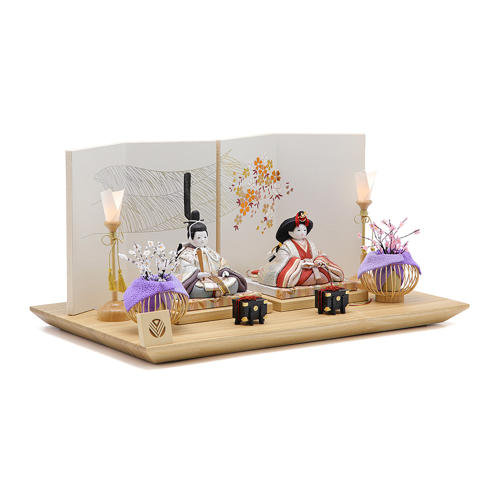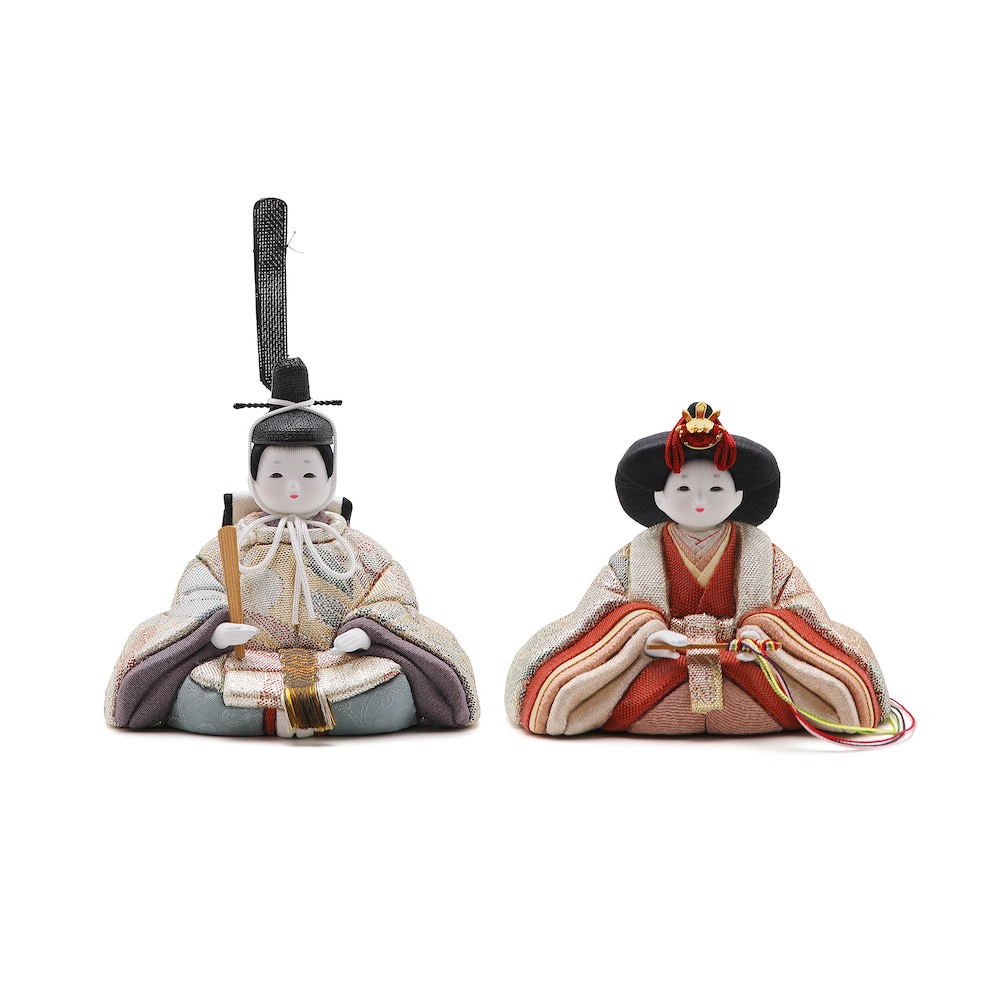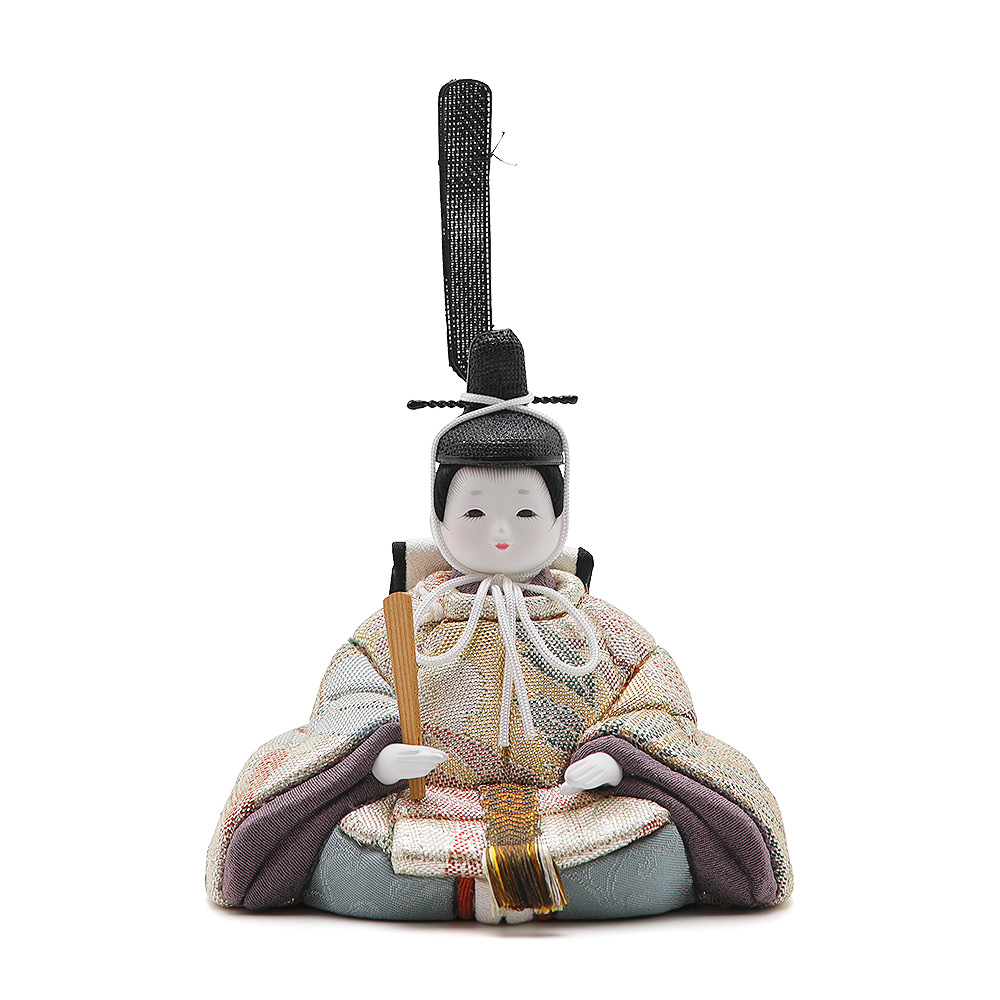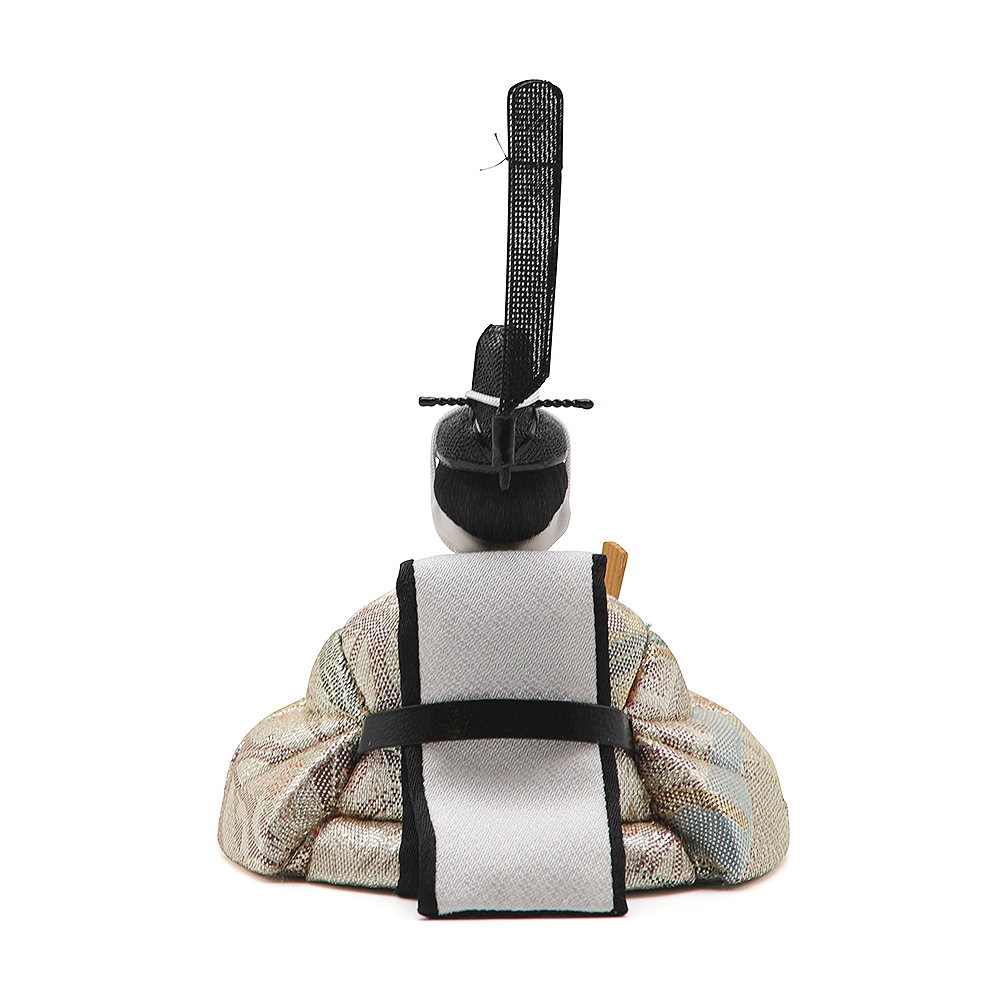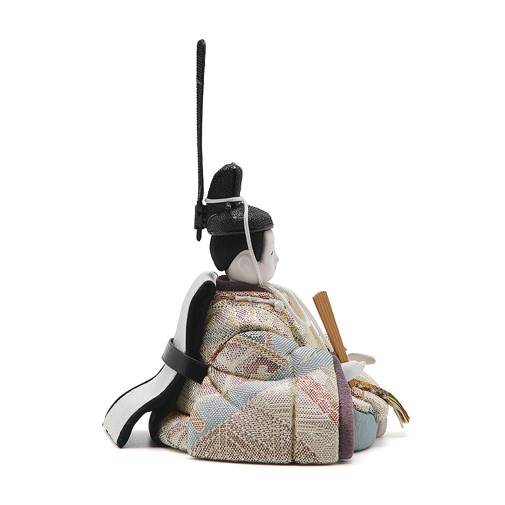 輝く帯地、佐賀錦のお衣装を身に纏う上品な親王様。そのお衣装の輝きから華やかさを感じつつも華美ではない品のある印象です。お衣装は工房こだわりのオリジナルの織物を使用しています。高貴で洗練された美しく、細部までこだわった親王様です。