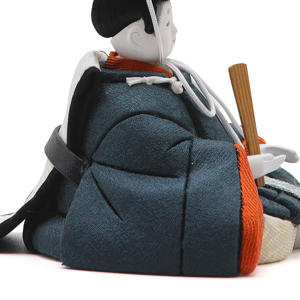 濃紺色と白を基調にしたお衣装に身を包む親王様。お衣装は工房こだわりの京都で生産した格式高い織物を使用しています。親王様での衣装の濃淡が伝統的でありつつ、現代的な印象も受け、大変魅力的です。