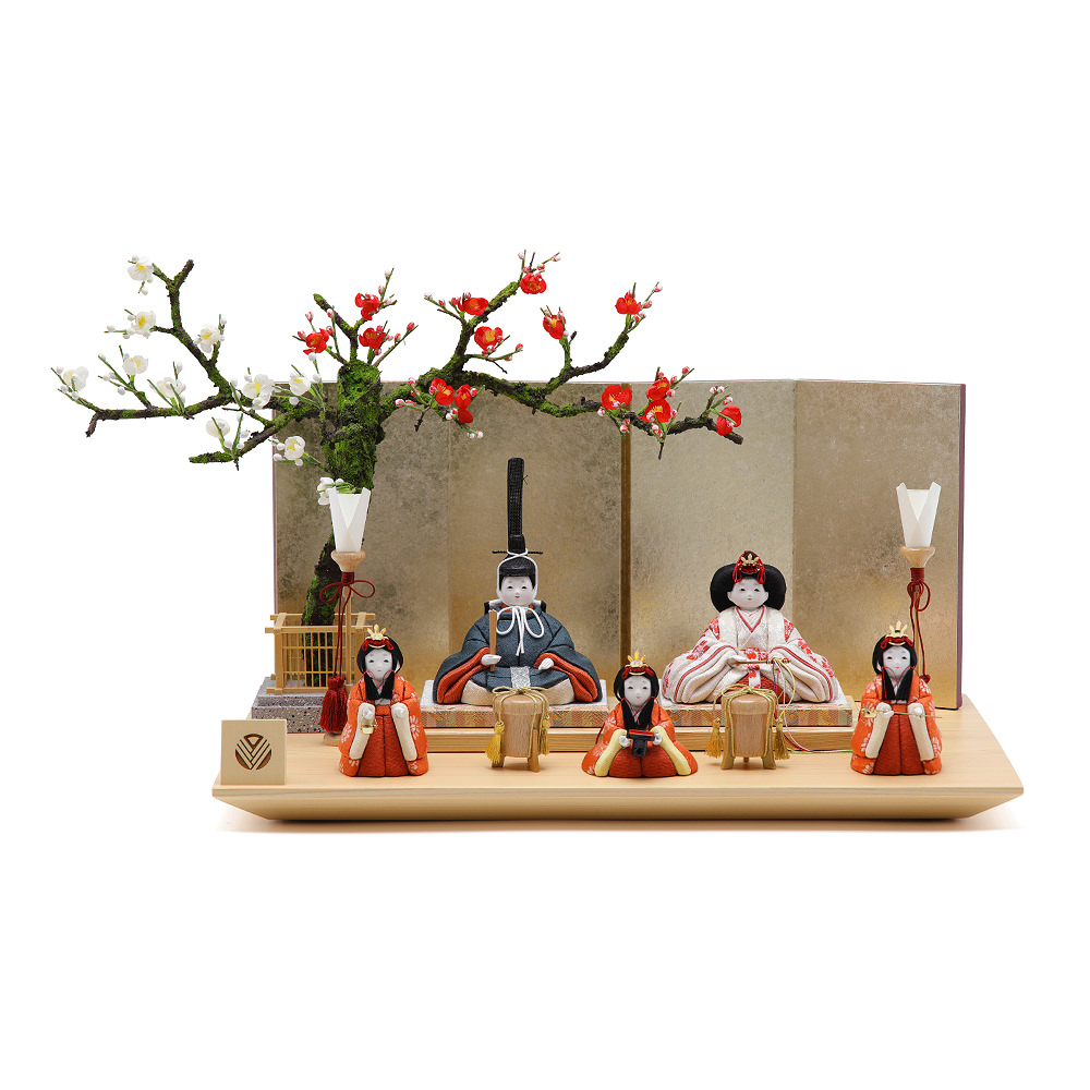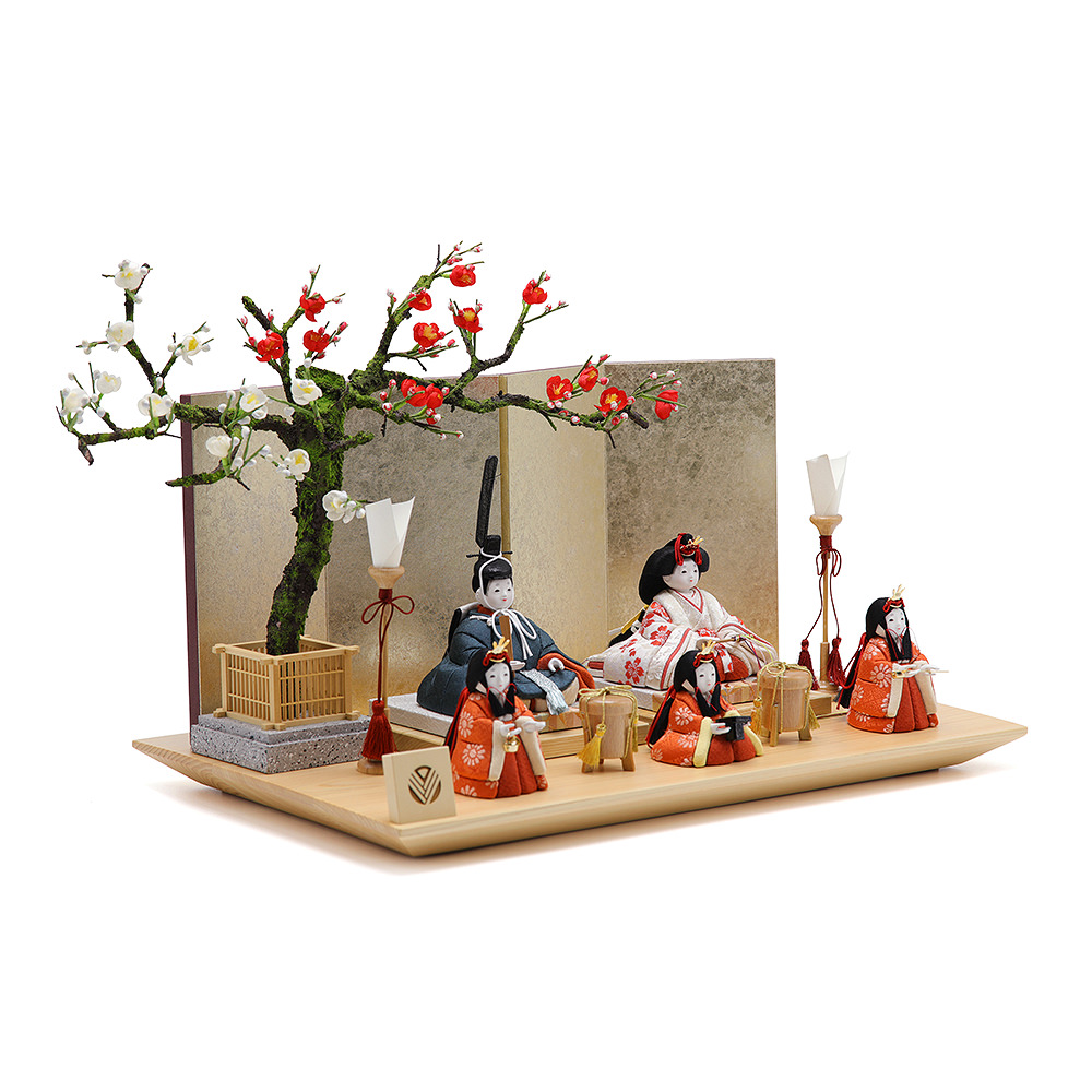 伝統的でありながらも現代的な印象のお人形と大きな梅の木、シンプルでありながら、華やかで魅力溢れる五人飾りです。