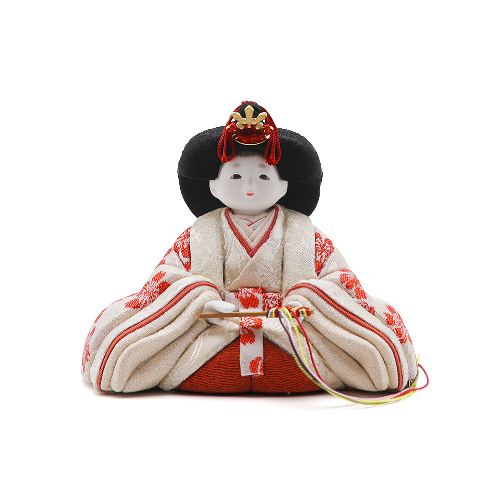 殿は濃紺を基調に上品な雰囲気、近くでよく見ると同色で和柄が施されています。また姫は白を基調に可愛らしい赤で描いた桜のお花柄です。女の子らしい可愛らしさを感じる美しい仕上がりとなっています。親王のお二人の対照的なお色の組み合わせが、伝統と現代の印象が同居する大変魅力的なお衣装です。