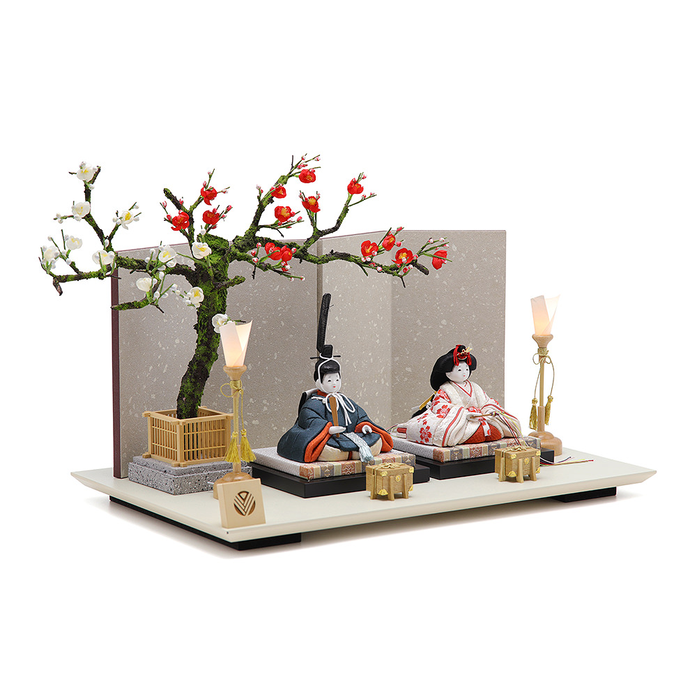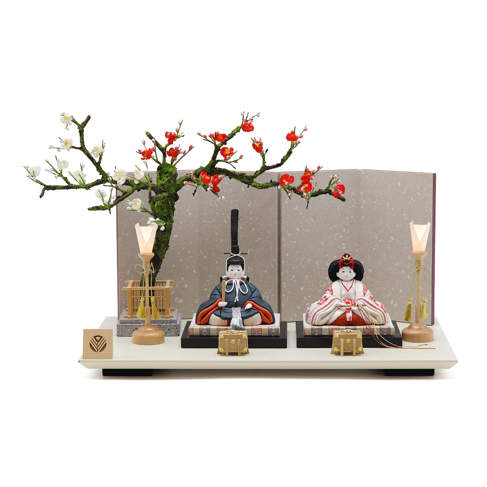 飾り台は一閑塗の飾り台。一閑塗りは和紙などを飾り台に張り、その上から塗りを施すことにより、飾り台の表面に質感をもたせたり、強度を上げて丈夫に使用できるようにする特殊な技法です。飾り台表面には細かな凹凸とざらっとした質感がございます。お色は日本の伝統的な色である象牙色(白と薄いグレーのような色の中間色)で仕上げました。屏風は、静岡県で製作した洗練された印象の灰色の屏風。漆喰塗りのような質感のある落ち着いた印象があり、少々光沢のある不揃いな柄がアクセントです。立雛を華やかにする大きな梅の木を添え、飾りをまとめています。