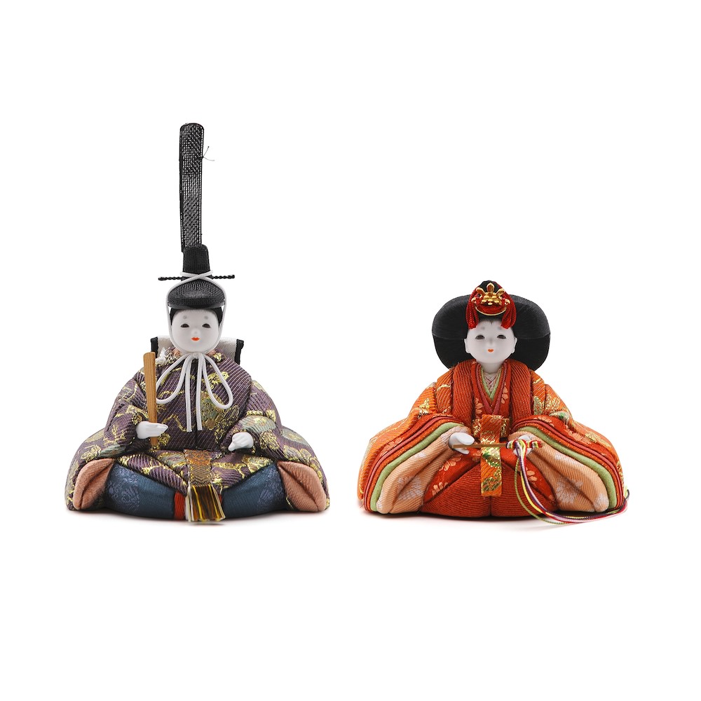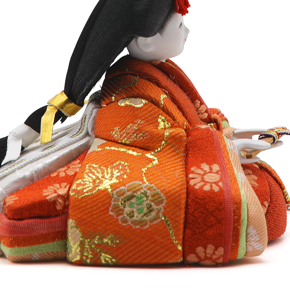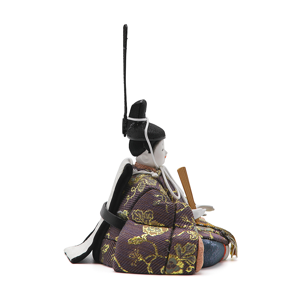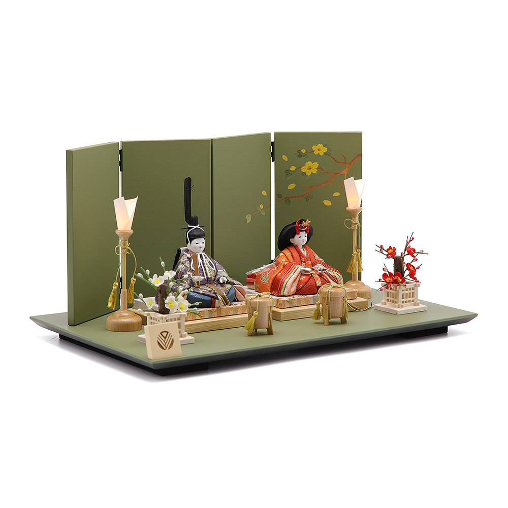 飾り台と屏風は、ともに高岡漆器の富山県高岡にて製作した一閑塗りの品。一閑塗りは和紙などを飾り台に張り、その上から塗りを施すことにより、飾り台の表面に質感をもたせたり、強度を上げて丈夫に使用できるようにする特殊な技法です。飾り台・屏風表面には細かな凹凸とざらっとした質感がございます。お色は日本の伝統的な色である麹塵色(少々灰色がかかった薄緑のようなお色)で仕上げ、屏風にはシンプルな桜の木の蒔絵を描きました。