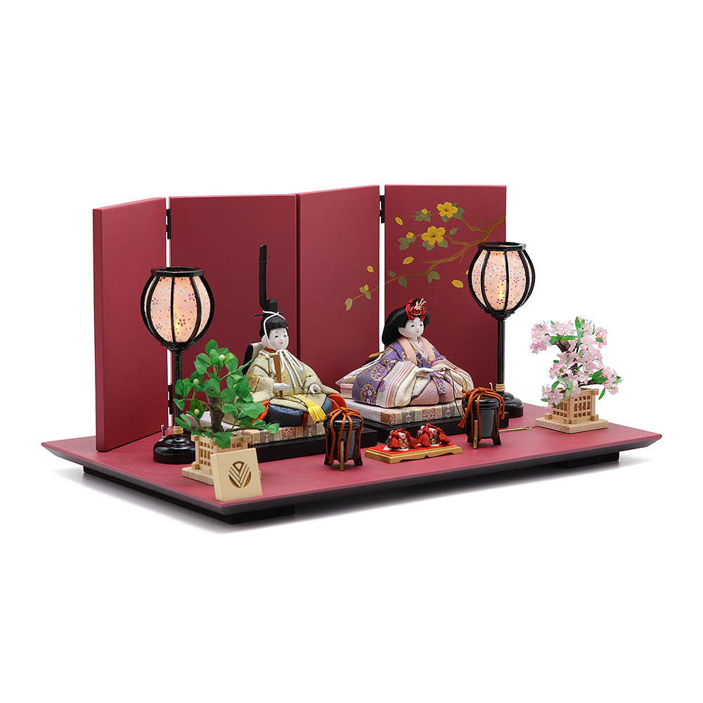 飾り台と屏風は、ともに高岡漆器の富山県高岡にて製作した一閑塗りの品。一閑塗りは和紙などを飾り台に張り、その上から塗りを施すことにより、飾り台の表面に質感をもたせたり、強度を上げて丈夫に使用できるようにする特殊な技法です。飾り台・屏風表面には細かな凹凸とざらっとした質感がございます。お色は日本の伝統的な色である周防色(赤色と濃い桃色の中間色のようなお色)で仕上げ、屏風にはシンプルな桜の木の蒔絵を描きました。