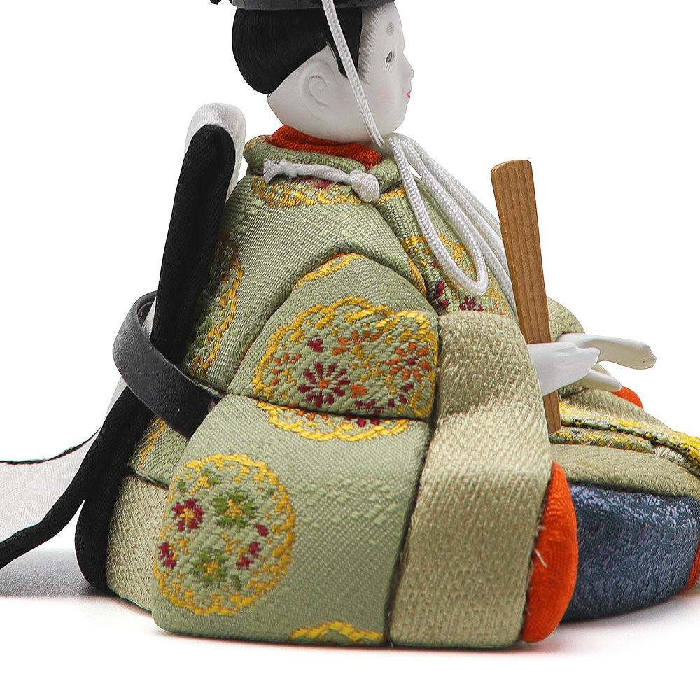 優しい日本的なお色の親王様。色と柄違いの鞠柄が格式高く品のある印象です。お衣装は工房こだわりの京都で製作した、格式高い正絹の織物を使用しています。高貴で洗練された美しく、細部までこだわった親王様です。