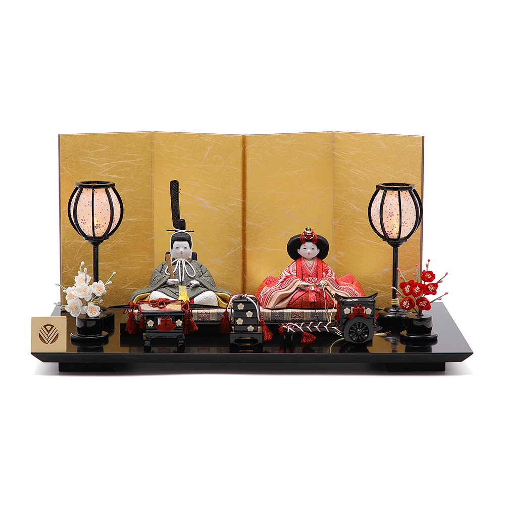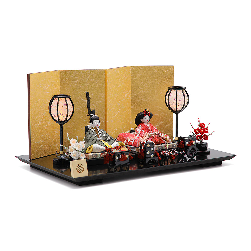 麹塵色と鮮やかな赤色のお衣装の組み合わせが魅力的な親王様。伝統的な日本柄の落ち着いた雰囲気と格式高い印象が大変魅力的です。お衣装は工房こだわりの京都で製作した、格式高い正絹の織物を使用しています。