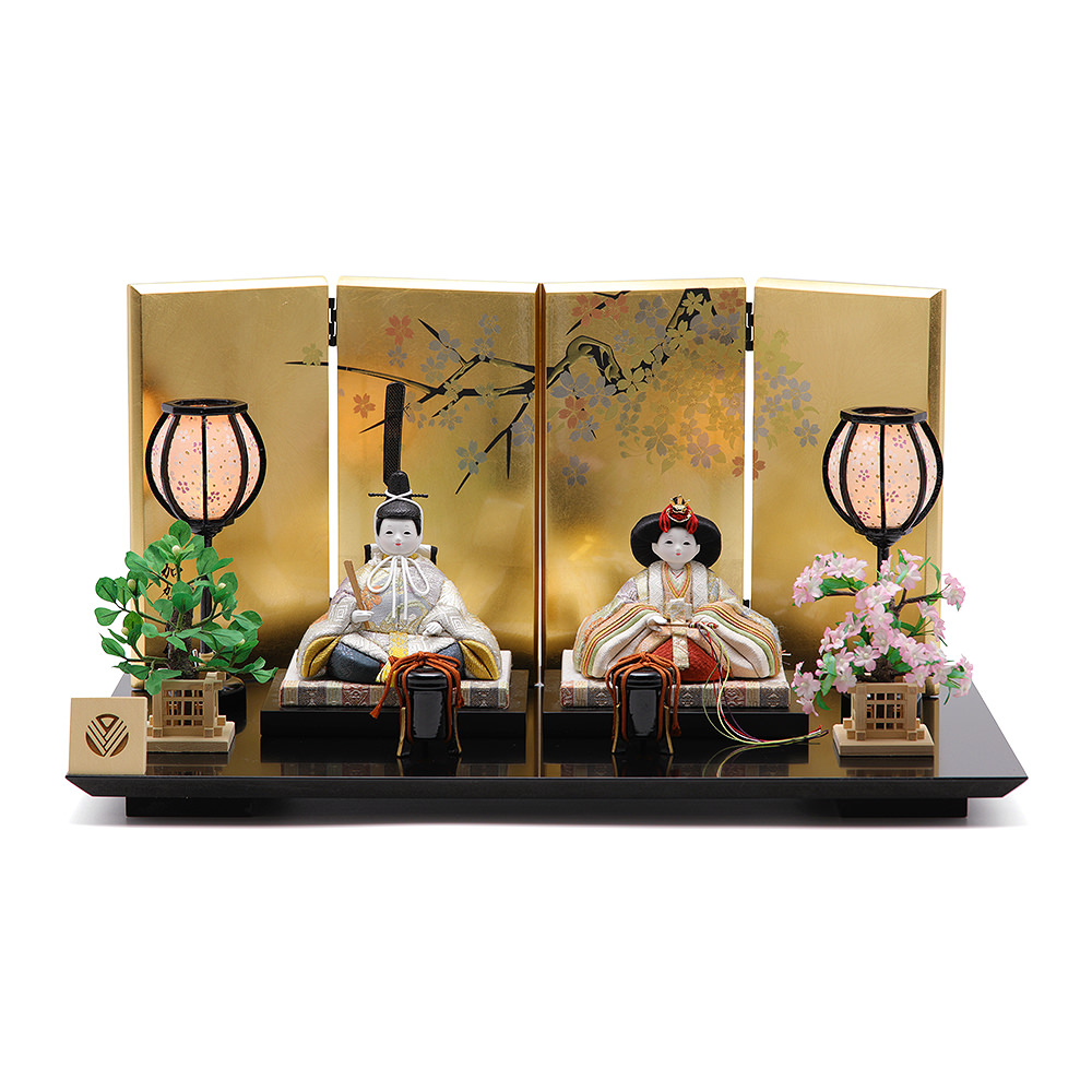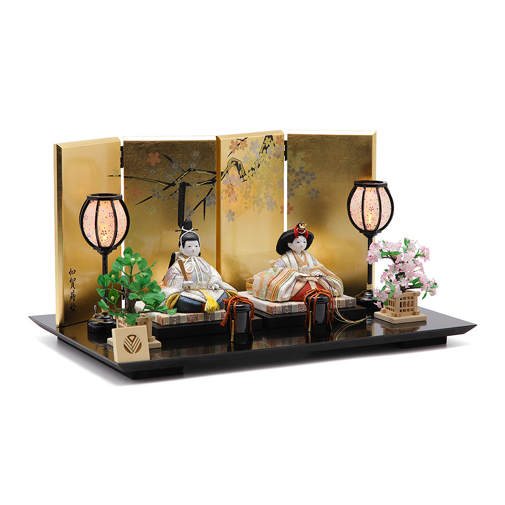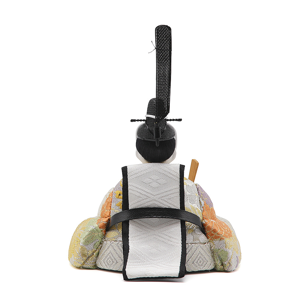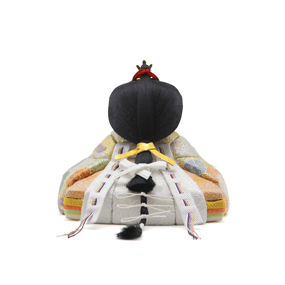 輝く帯地、佐賀錦のお衣装を身に纏う上品な親王様。そのお衣装の輝きから華やかさを感じつつも華美ではない品のある印象です。お衣装は工房こだわりのオリジナルの織物を使用しています。高貴で洗練された美しく、細部までこだわった親王様です。
