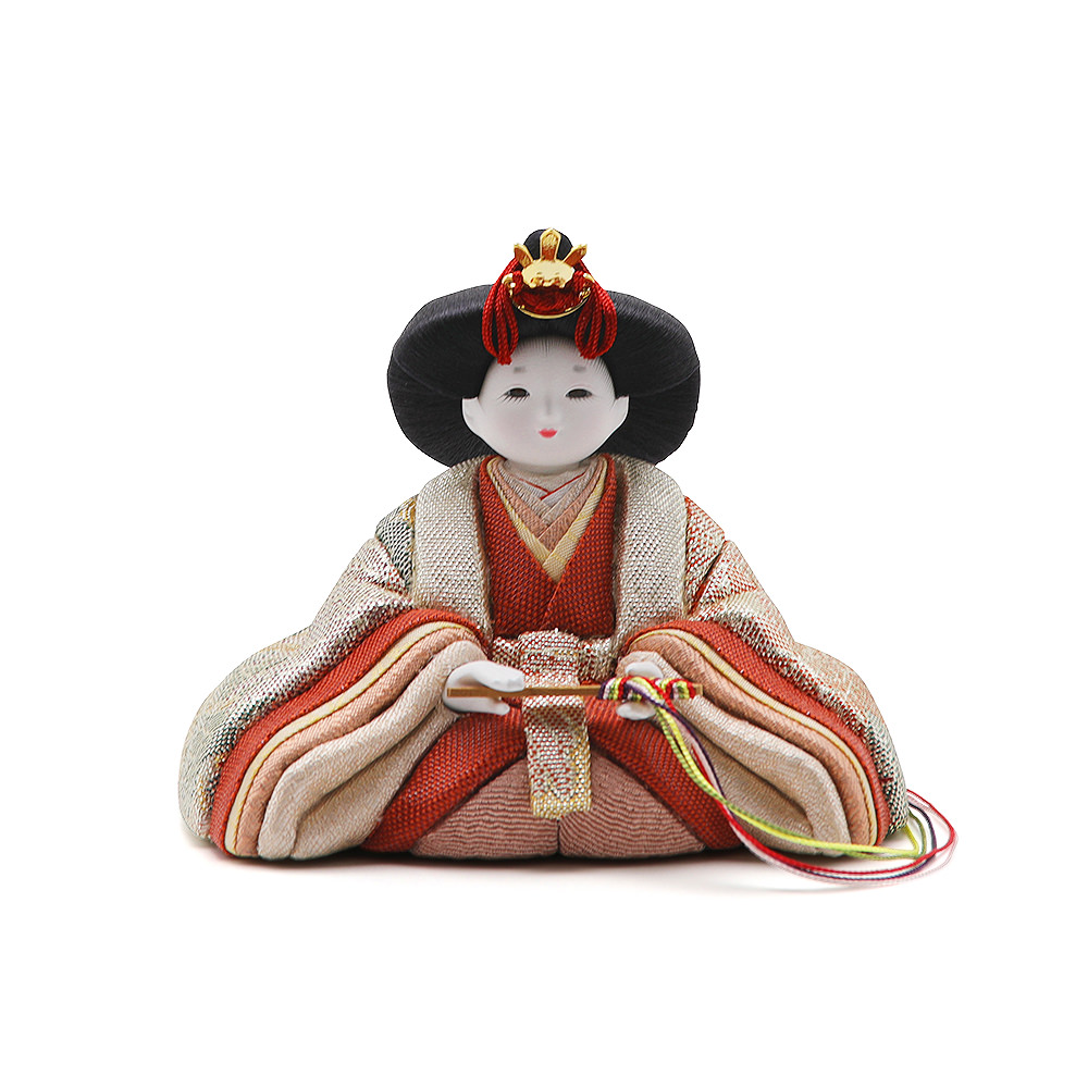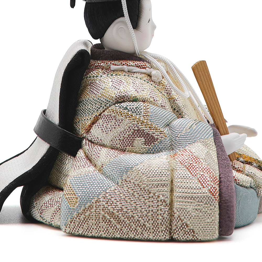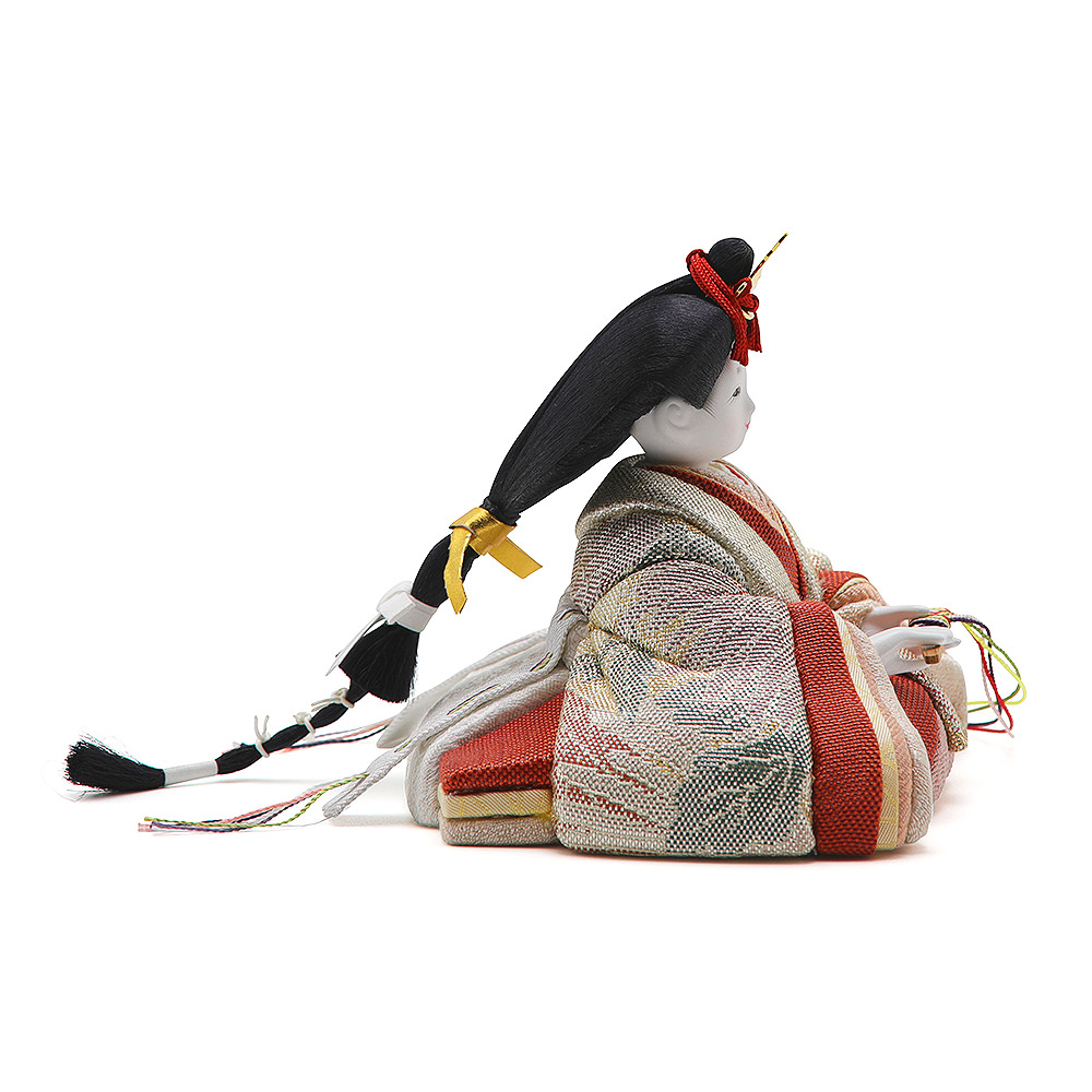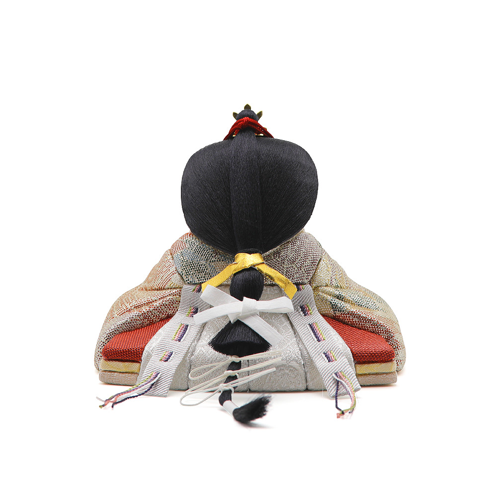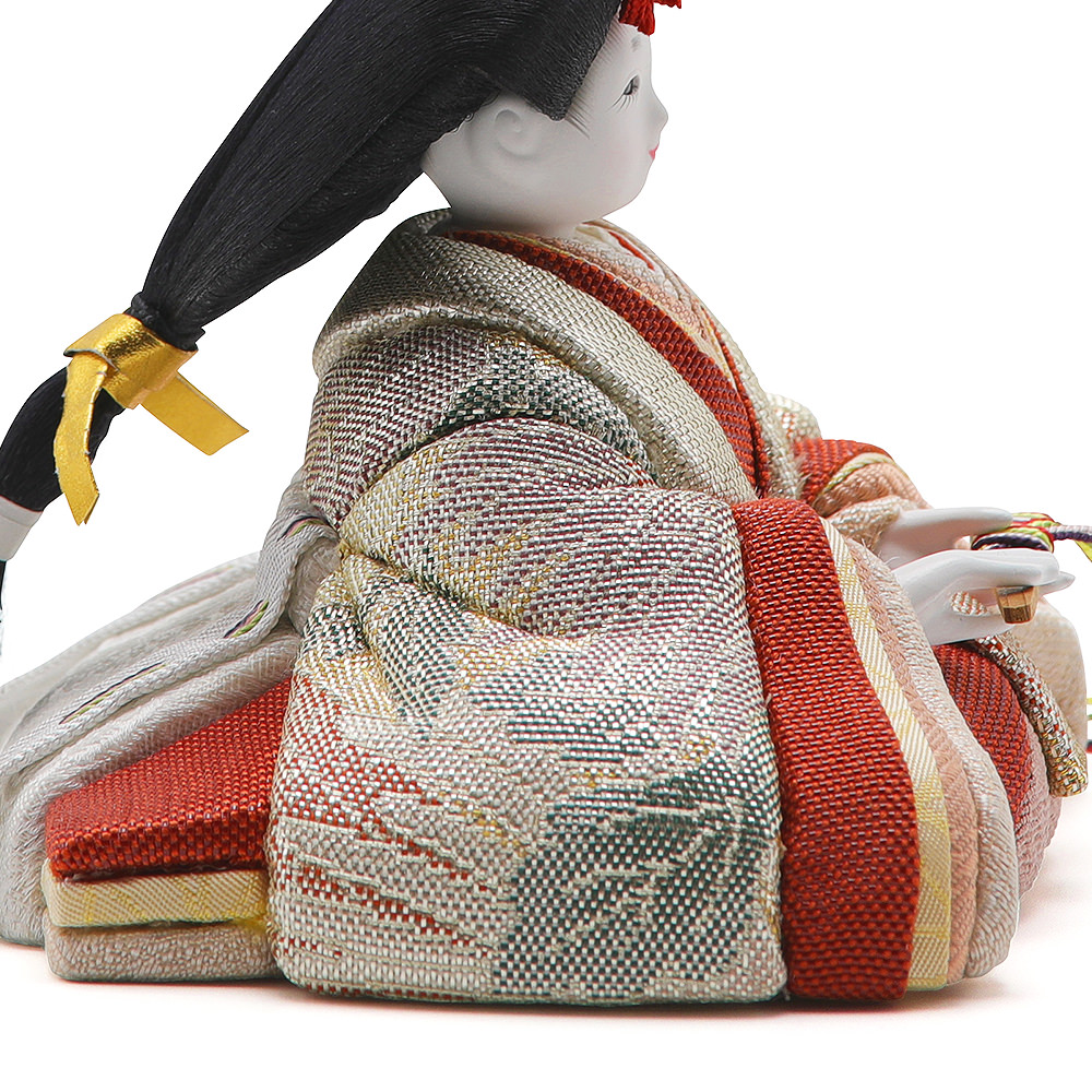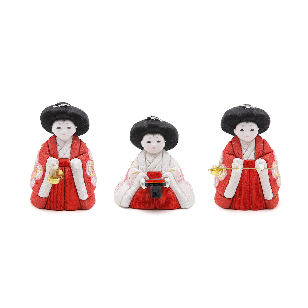 三人官女のお衣装は、刺繍入りの正絹の丹後縮緬です。座官女は白地、立官女は赤地のお衣装に白とピンクを中心に大きな梅の刺繍を施しています。清楚な印象ながら、可愛らしさのある三人官女です。