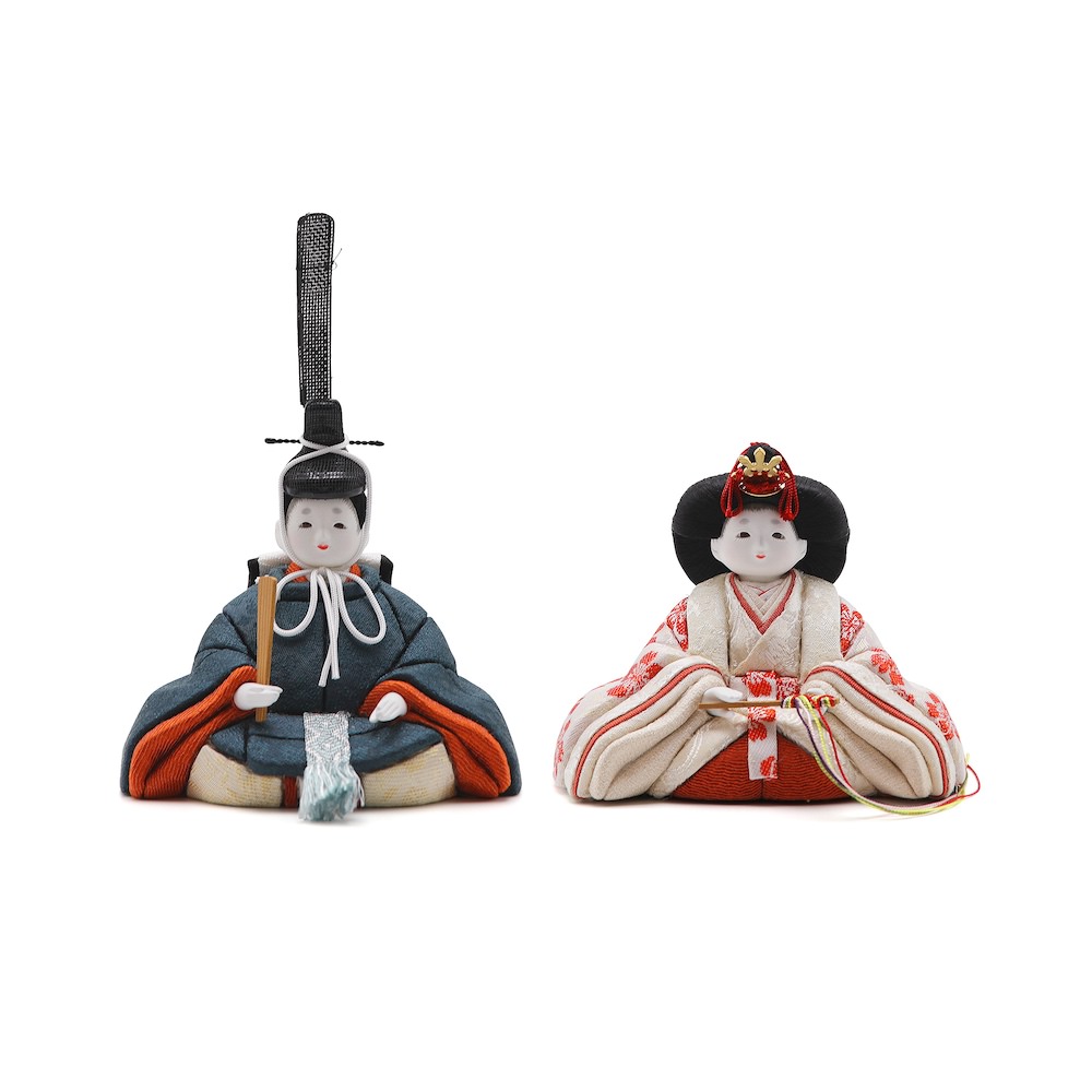 殿は濃紺を基調に上品な雰囲気、近くでよく見ると同色で和柄が施されています。また姫は白を基調に可愛らしい赤で描いた桜のお花柄です。女の子らしい可愛らしさを感じる美しい仕上がりとなっています。親王のお二人の対照的なお色の組み合わせが、伝統と現代の印象が同居する大変魅力的なお衣装です。