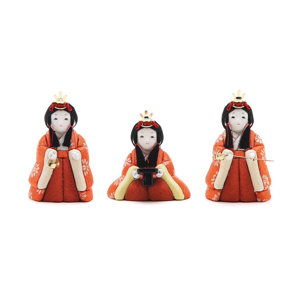 三人官女のお衣装は正絹金襴を使用しています。可愛らしい朱色の地に小花柄のお衣装を主役に袖口は生成り色、薄い黄色、袴も朱色の縮緬で合わせました。くすんだお色の朱色が主役の可愛らしい三人官女です。